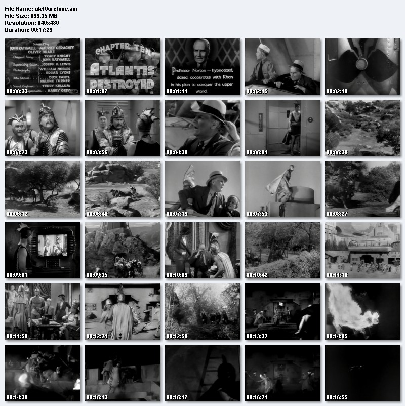 Crash Corrigan, a recent graduate of Annapolis, and Diana, a go-getting reporter, join Professor Norton for a search for the source of a string of earthquakes, Atlantis. They ride Prof. Norton's rocket submarine searching the sea and little Billy Norton, the professor's son stows away, of course. When they find Atlantis they are caught in a war between peaceful Atlanteans, note their white capes, and war-monging Atlanteans, note their black capes. After many harrowing moments for Crash, Diana, Prof. Norton and Billy, they barely get away with their lives when they escape a tower of Atlantis raised to the surface for the sole purpose of dominating or destroying the Earth (Which one depends on the compliance of the upper world dwellers.) |